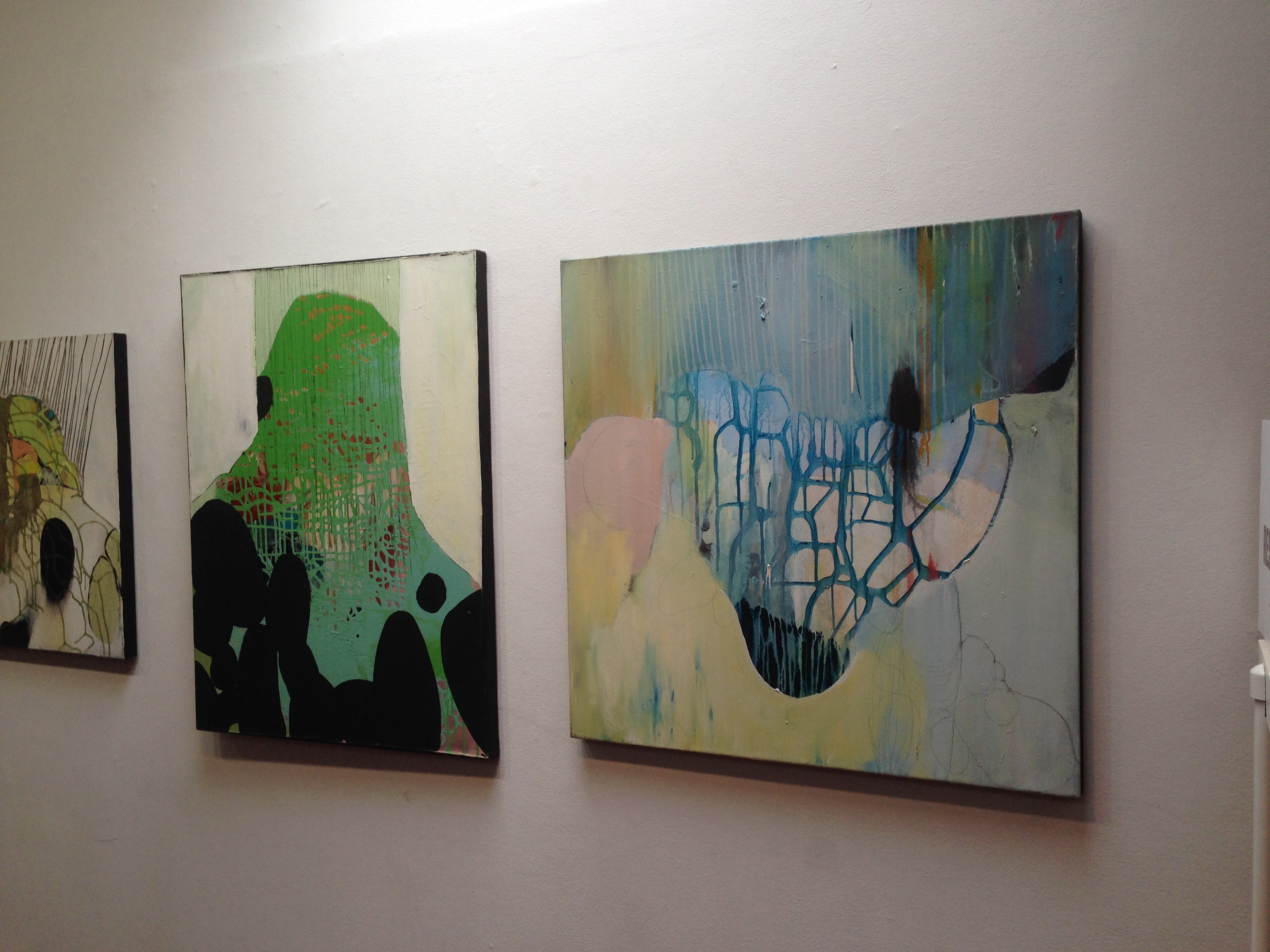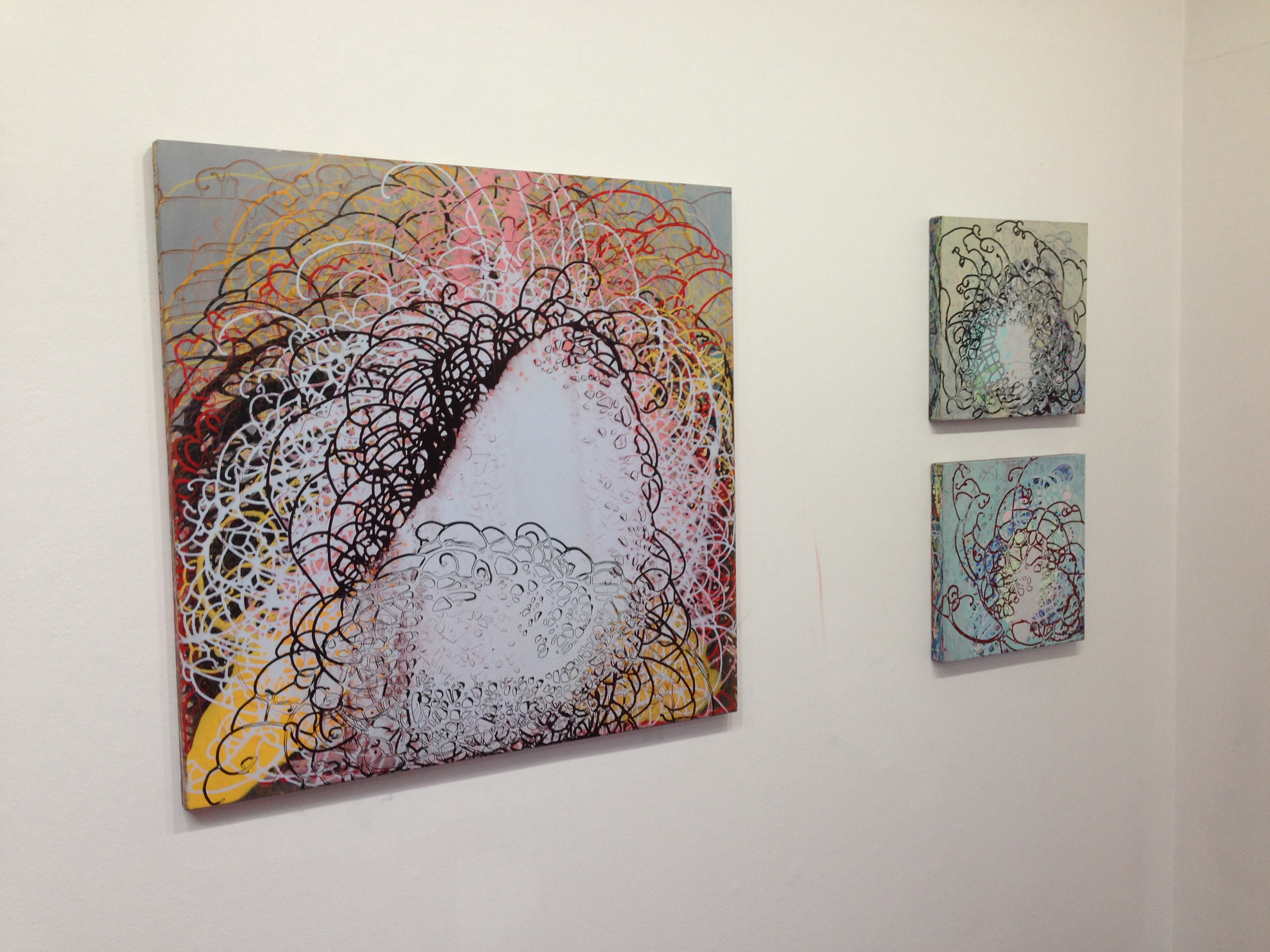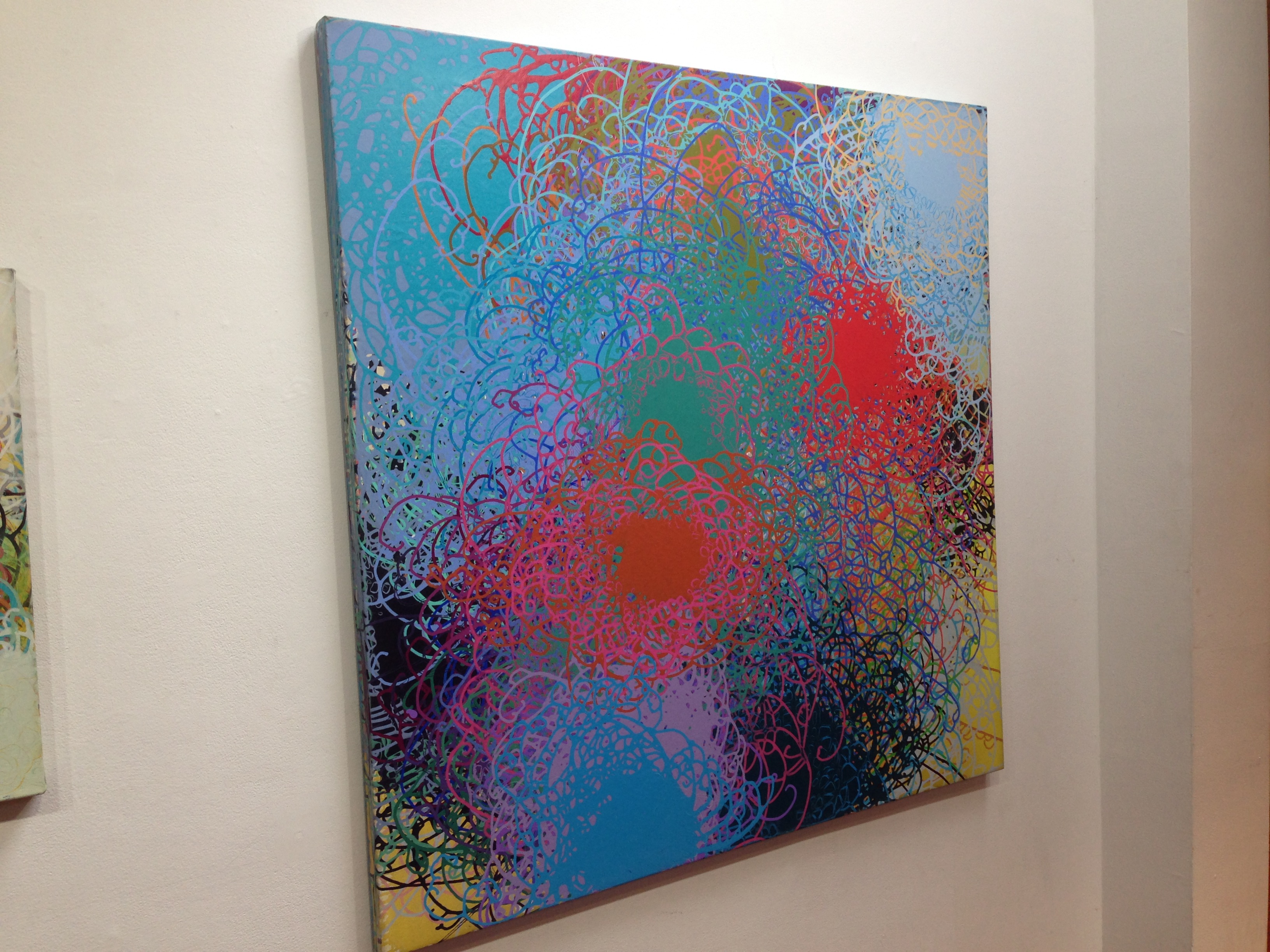 If you know my own crazy use of color in my fiber art work, it should be no surprise that I love the saturated vibrant colors of Minah’s 2012 series. The scale of these canvases is also a factor in my appreciation for the depth and intricate details across such a wide surface. I especially liked the “traditional factors” (2012) which is 70″ x 70″ with exquisite pools of lavender, greens, and blues that are surrounded by these thread-like curls of electric orange and fiery pink-red hues that make the entire piece glow.